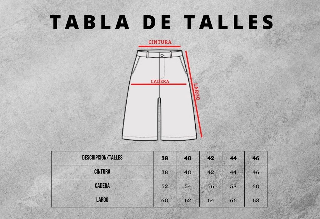Chequea nuestra tabla de medidas que esta a continuacion y comparala con algun jean que te quede bien. Te recomendamos que para tomar las medidas lo apoyes en una superficie plana.